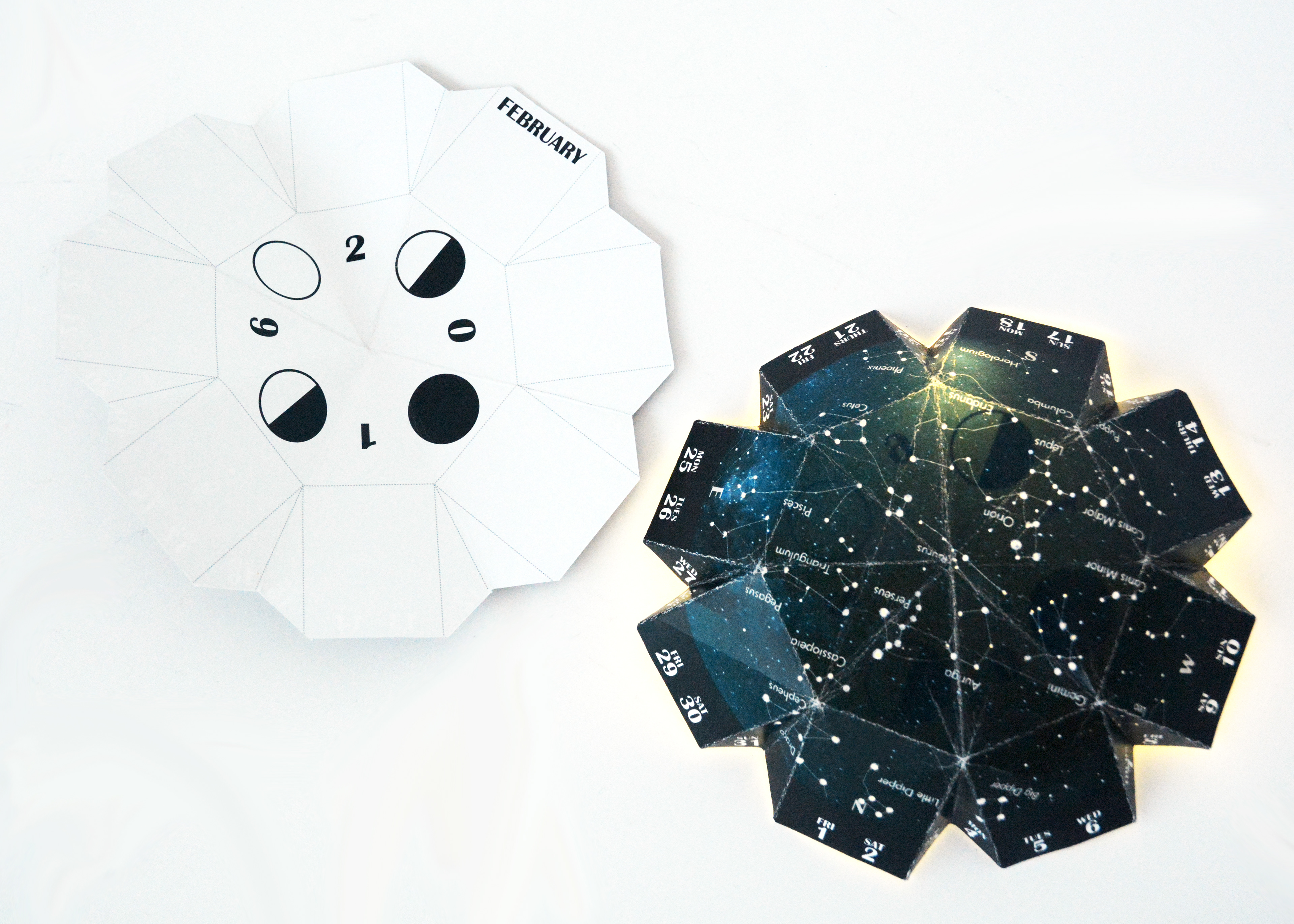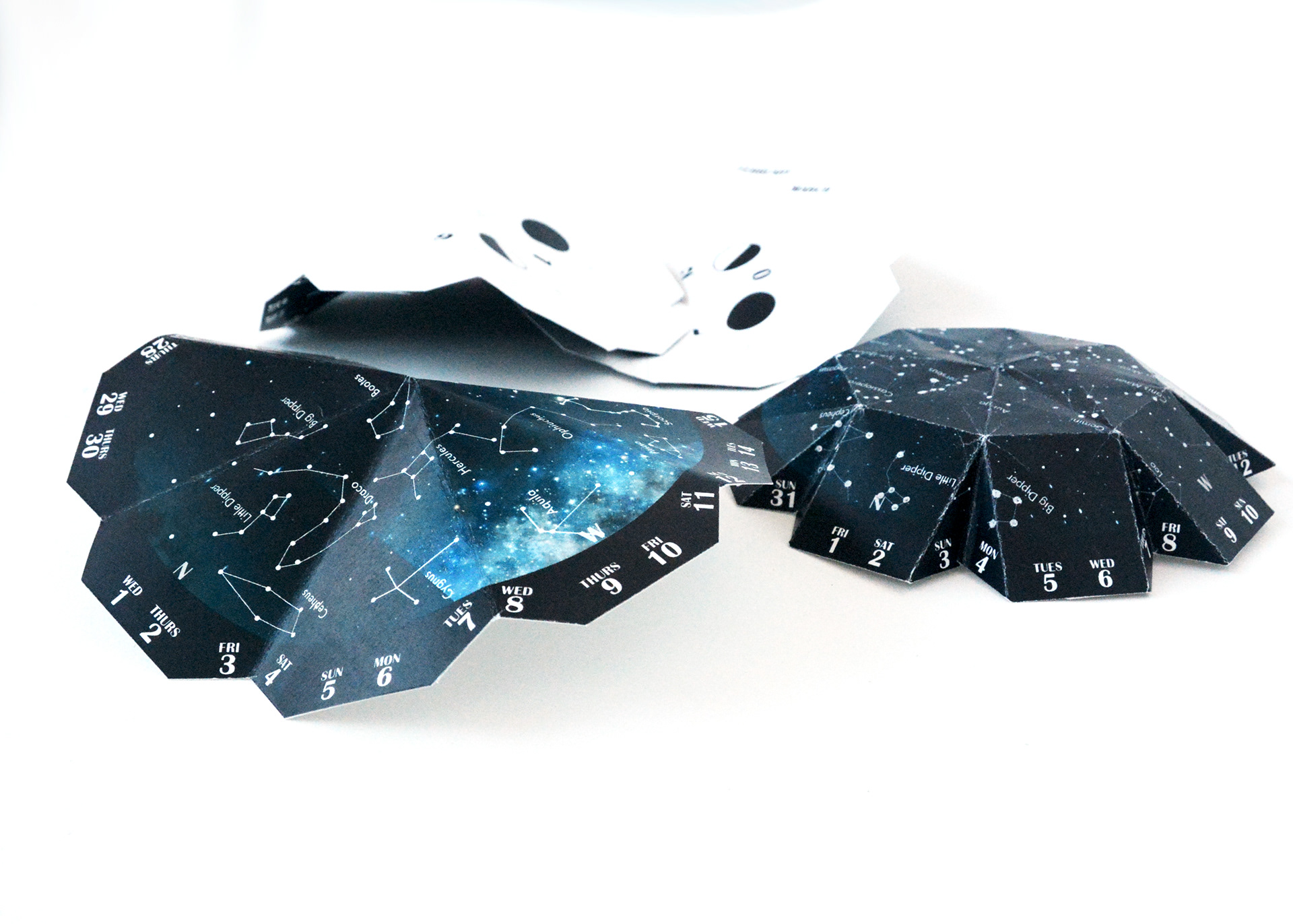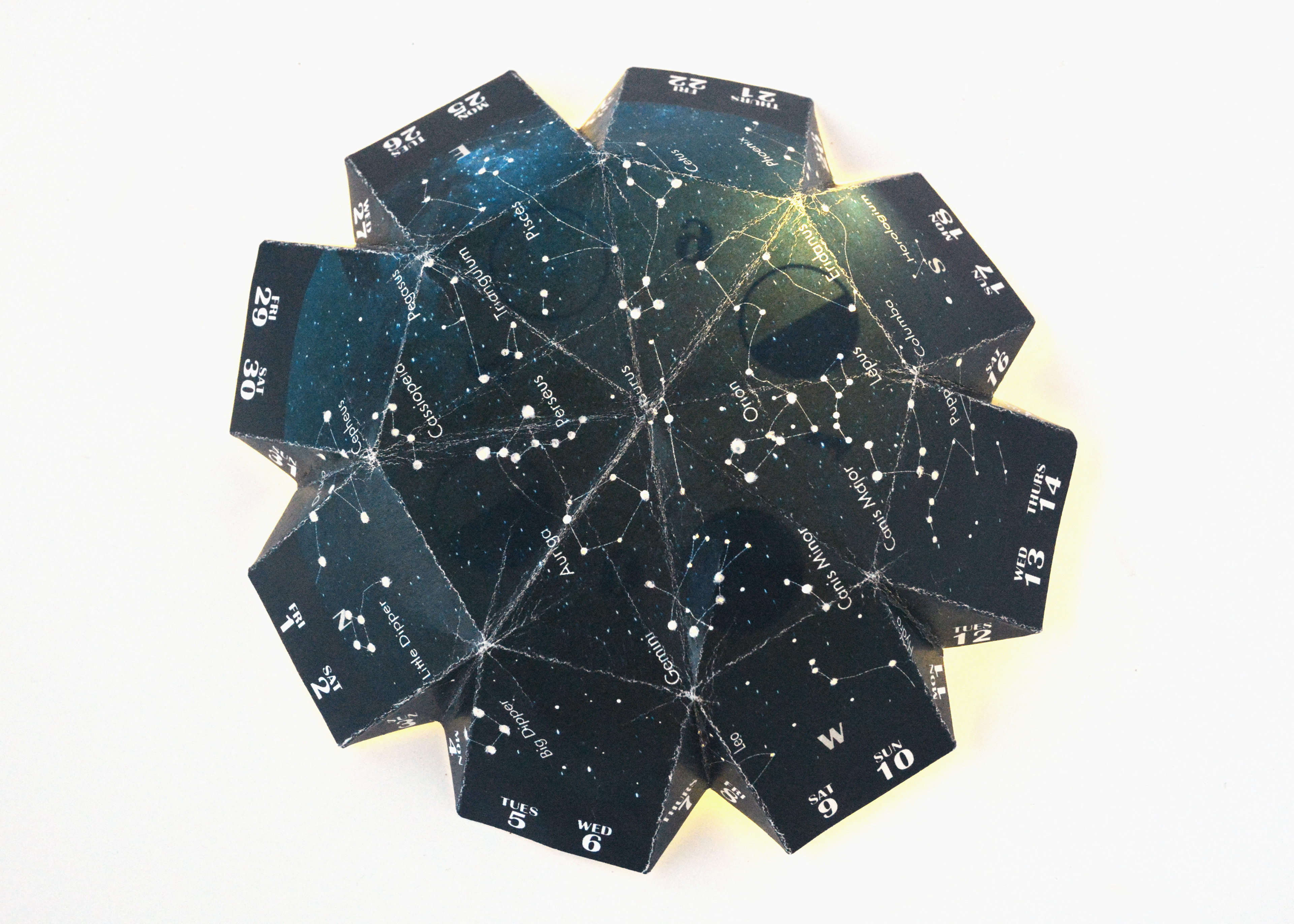 Interactive calendar that shows the monthly constellations that can be seen in the night sky. The concept was to fold the paper calendar into a dome your cellphone could fit under and the flashlight on your phone would illuminate the constellations.